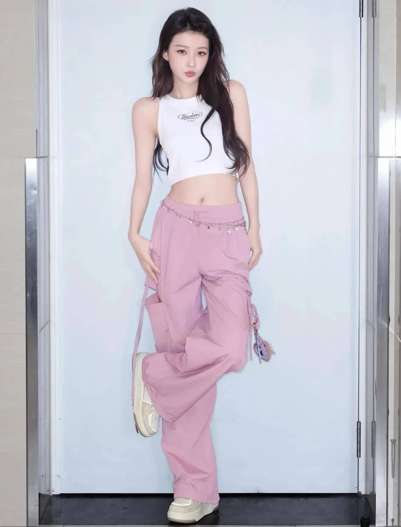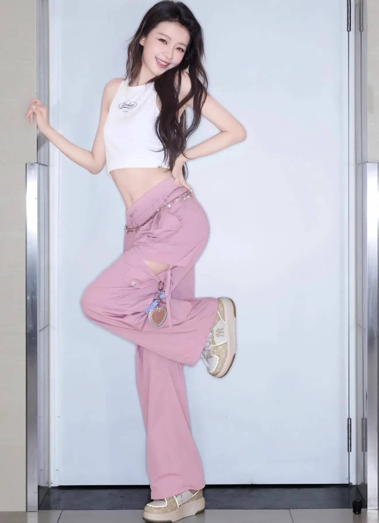 纤细的胳膊与白色无袖短背心搭配,简约利落!中和了樱花粉工装裤的柔和感,增添了几分清爽酷感。高腰款樱花粉工装裤宽松挺括,既能修饰腿型,又能拉高腰线,搭配上衣塞穿的小技巧,瞬间优化身材比例,让170cm的身高更显高挑,大长腿优势尽显。