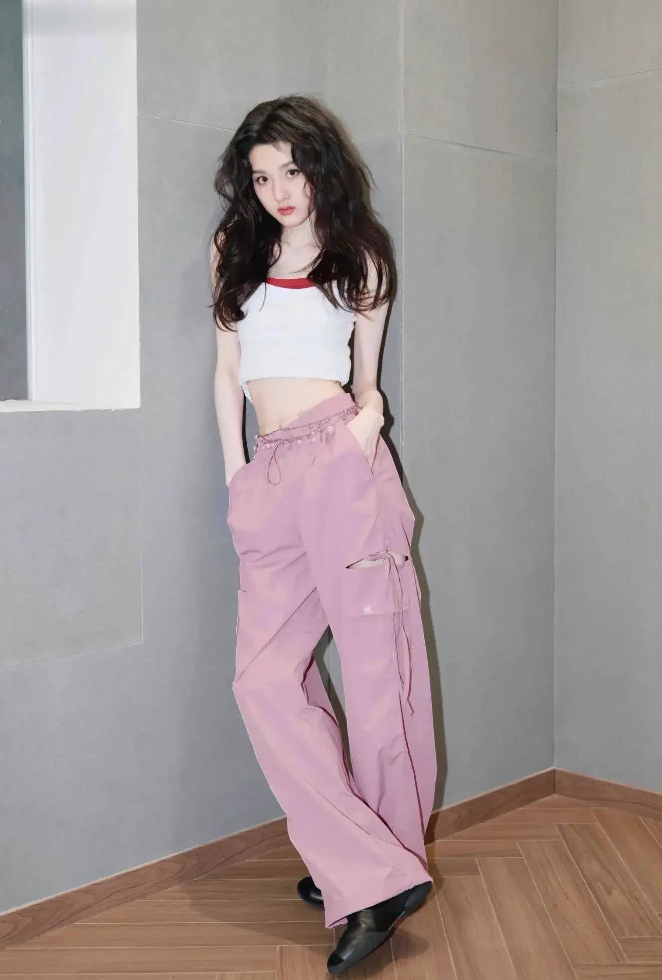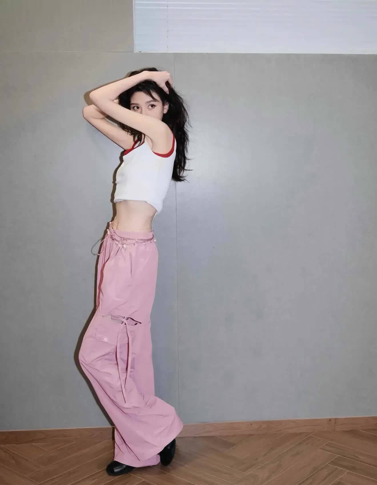 宋祖儿:红色吊带叠搭白色背心+工装裤!